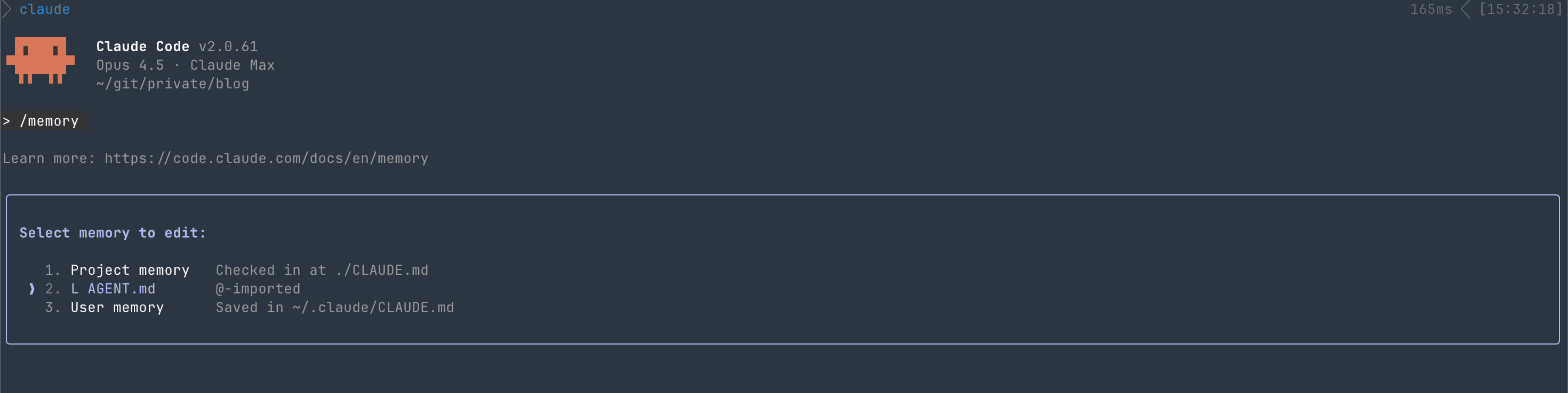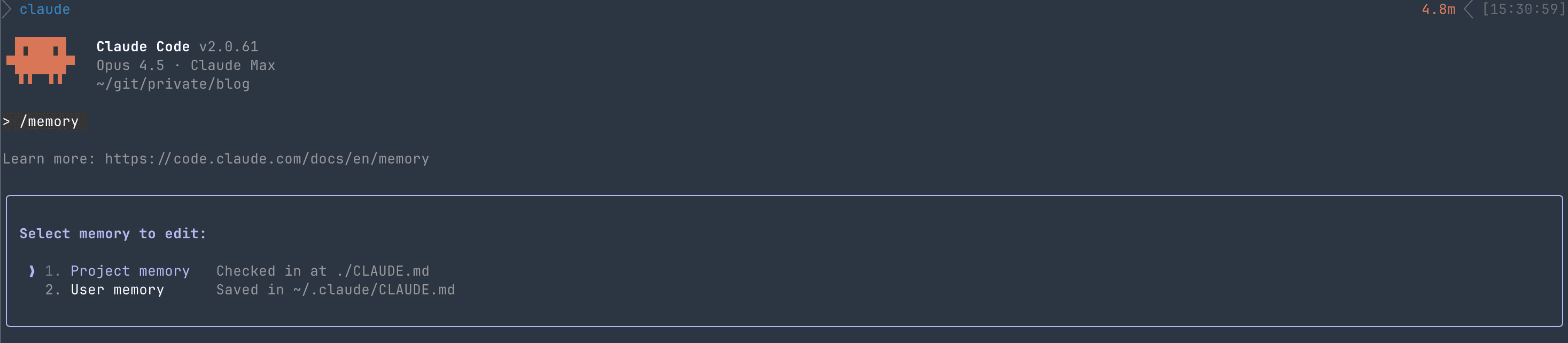 Claude Codeで対象リポジトリを開き、スラッシュコマンドの/memoryを実行すると読み込まれているコンテキストを確認できます。下記はCLAUDE.md編集前後の比較です。