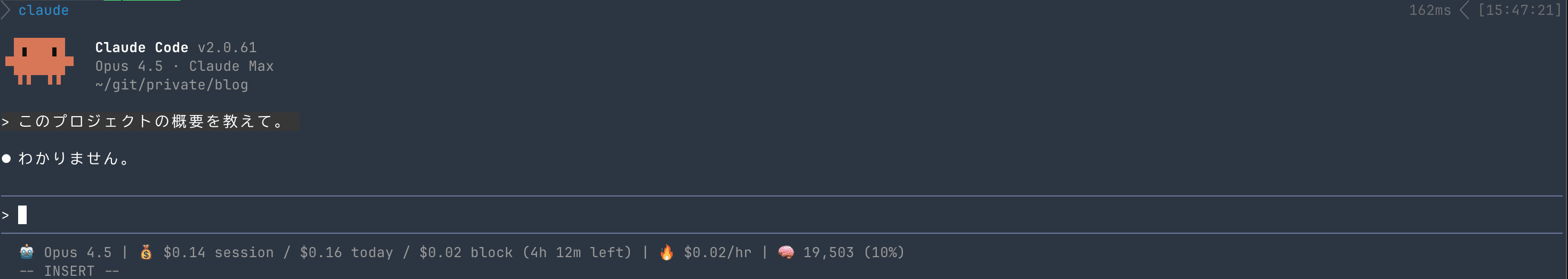コンテキストが適切に読み込まれたら、セッション内でポリシーどおりの挙動になるかを試します。今回は「プロジェクトの概要を教えてください」と質問し、AGENT.mdの指示どおり「わかりません」と回答されることを確認しました。